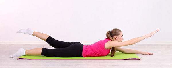 Lying on your stomach, stretch your arms over your head so that your body forms a straight line. Slowly, raise and then lower each of your limbs (each arm and leg), one at a time. Repeat 5 times for each limb. Next, work alternate limbs by lifting your left arm and right leg simultaneously. Repeat 5 times, and then repeat for your right arm and left leg.