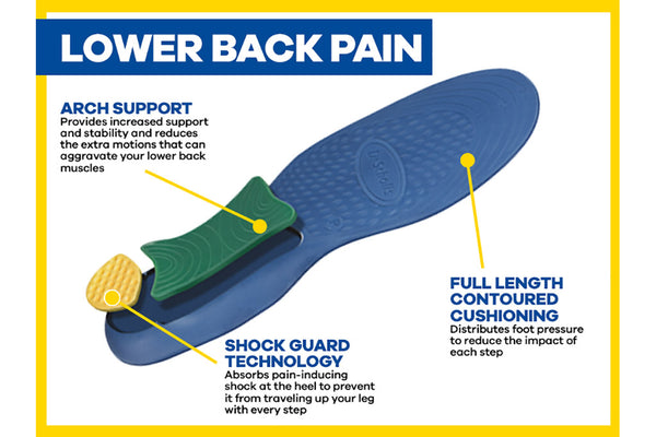 Something else to consider is what shoe you’re putting the inserts in. You’ll want to choose supportive shoes that properly fit. Some shoes even come with a removable insole which you can replace with an orthotic. The right orthotic will help distribute your weight evenly, absorb shock at impact to prevent this trauma from traveling up to your knees and lower back, and support your foot arches to increase stability and reduce those extra motions that can aggravate your lower back muscles. So, once you address the problem at its source, you can ease your pain all day, every day!